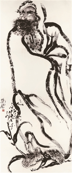 陆尚先生之画如同其人,率性而天真。无论创作儒门名士还是禅宗大德,都彰显他内心的两个字:“通透”。作品看似构图随心所欲,实则章法严谨深沉;笔法不拘一格却并不失中国画的笔墨精神。外消诸相而内存实理,恰如禅宗安心不可执相而求。什么是相?说外象是相,虽然没错但认知过于肤浅。其实固守法度,与大众知见和光同尘更是一种着相。就禅主题画的形式而言,我们通常看到的“禅画”其实是国人传统心性中道家思想的体现,将主张大道至简的虚谷情怀偏盖佛教禅宗的空性思想,凸显离尘超凡的处世境界。而禅,实则是蕴含于世间万法万象之中的,就如六祖大师所说,佛法在世间,不离世间觉。禅本身并不是一个境界,一种行相,而是一个证得涅槃妙心的修行法门,一个破色成空明心见性的刹那过程。陆尚先生的画在达摩禅意的表现上突破一般形式,采取动静相合的构图、繁简兼具的笔触,由尘见性的手法,使禅从天然意趣出发,转入真如意境。虽保留了通行的达摩祖师外形,却在笔意笔法和构图章法上进行突破。妙高意趣如同青原行思大师所说的彻悟之心,虽看山还是山,境上却已然非常。虽画达摩实非达摩,而是画表出了禅门无相涅槃之真实面目。