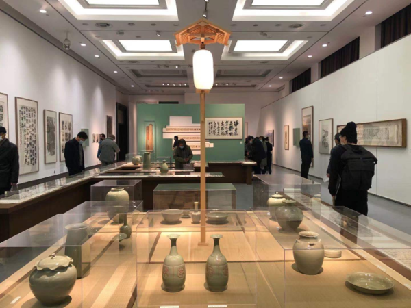 展厅中央的瓷器展示区域,规格很高,作者包括陈淞贤、徐朝兴等陶艺名家,主要呈现的是越窑秘色瓷。“九秋风露越窑开,夺得千峰翠色来。”这是唐人陆龟蒙的诗句,浙江省文史馆专职副馆长姜玉峰说:“艺术家们以全新的目光凝望历史,把诗画、山水、名人等元素融入越窑青瓷艺术创作中,活化传统青瓷技艺。”
