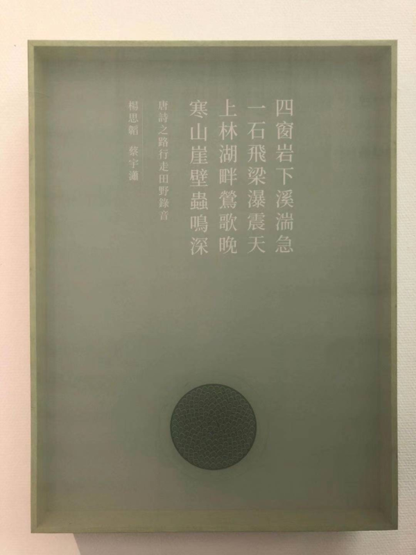 1号展厅里,墙上分布着几个青色小方盒,上面各有一首不同的诗,凑近仔细听,里面还会传出不同的声音,有艺术家读诗的、也有古琴曲、还有唐诗之路采风时的田野录音。通过人声、音乐、音效的创意融合,一下子让静态的展品生动起来。