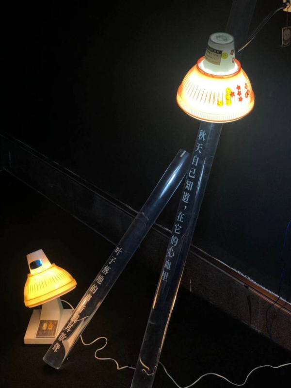 他从网上淘回来几个旧台灯,也加入进这件作品里,台灯灯罩上面还有几枚童稚的笑脸贴纸,像极了小时候在台灯上贴贴纸的自己,“这就是我们每个人接触唐诗的起点,小时候书桌上,一个台灯,一本唐诗。”高世强说,“唐诗对艺术作品的启示作用是巨大的,例如李白的山水观就与当代流行的山水想象不同,对李白而言,山水是求道之路,因古浙东山水有莽荒之气。古今山水不同,但同归于山水精神,敞开向深邃的宇宙观,这种更深层次的追求,可以让今天的艺术作品不囿于单一的路径而陷入重复空洞的危险之地。”