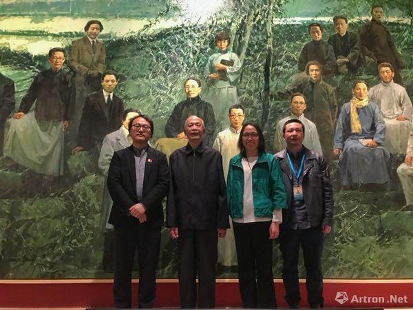 中国美术学院创办人蔡元培之子—蔡英多(左二)参观中国美术学院建校九十周年纪念展,与校庆大展作品中自己父亲与姐姐的艺术形象合影(图片来源:中国美术学院)