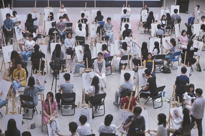 昨天上午9点前后,浙江美术馆中央大厅支起了近百个画架,浩浩荡荡,有点像艺考现场。