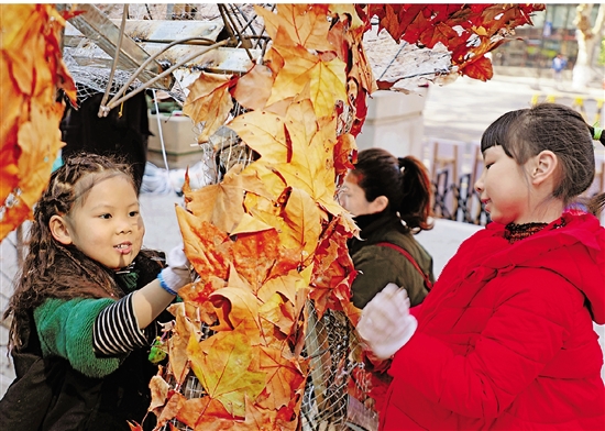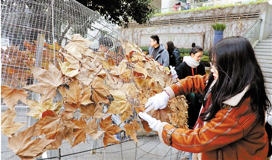 秋叶艺术节吸引越来越多人参与,美院毕业生寿潇雅说:“对秋天有特别的感情,所以报名参加了这个活动,我们递交的作品叫《秋林》,想通过艺术的表现手法,把落叶进行再造,重塑一片秋叶林。”除了美院师生,今年还有近300位志愿者一起参与入选作品的创作。