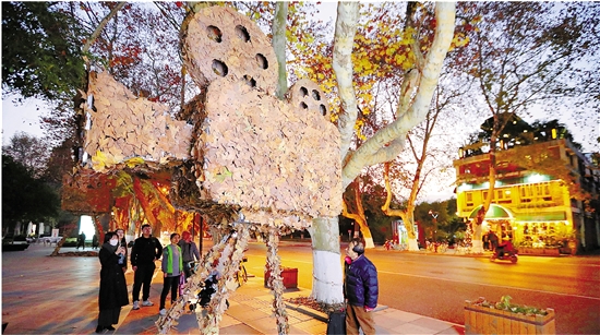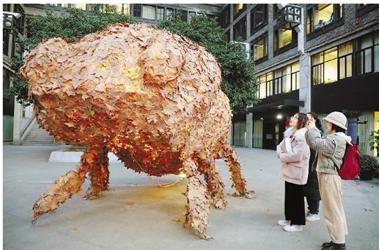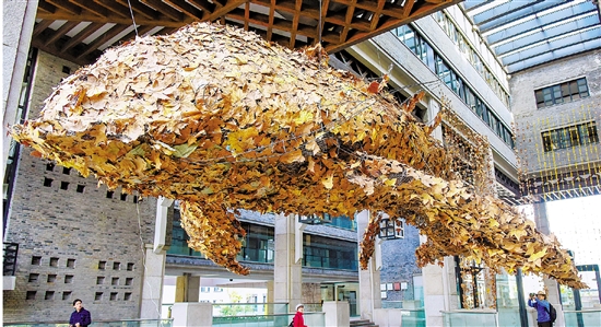 这几天,经过南山路,你会被美院门口一座4米多高、通体用金黄色梧桐树叶堆积起来的秋叶装置作品《掷铁饼者》所吸引。往前走,正门门厅下是一只巨型“金蝉”,不少游客拍照围观。到了美院中庭,一头10米长的“跃出海面的鲸鱼”悬在空中,更增添了蜕变为鲲鹏的意境。游客穿梭在庞然大物投射下的光影中,感受诗意与光景。