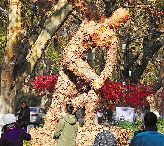 秋叶装置作品《掷铁饼者》吸引游客驻足欣赏。