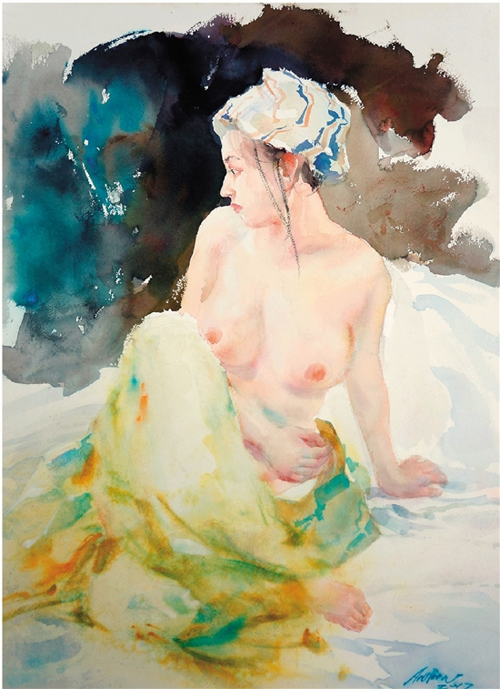 这其实是他研究西方绘画中面对自然世界的格物态度和寻求中国人绘画中那种向内聚焦自身人格的主体精神世界对客体世界映射。品读他的画,色彩明快而不轻飘,笔触流畅潇洒且浑厚,他把水彩画透明多变的色彩发挥到极致。如他的水彩画《守候的村庄》,面对繁杂的自然场景,他并没有沉湎于那种细致描摹对象每个繁杂细节的乐趣,而是注重自然物象的特质与生命气息。他的风景画既有如科特曼对自然场景整理的天赋,也有格尔丁灵动的用笔和透纳水彩绘画的那种激情澎湃,但他的水彩画却充溢着中国人气宇。
