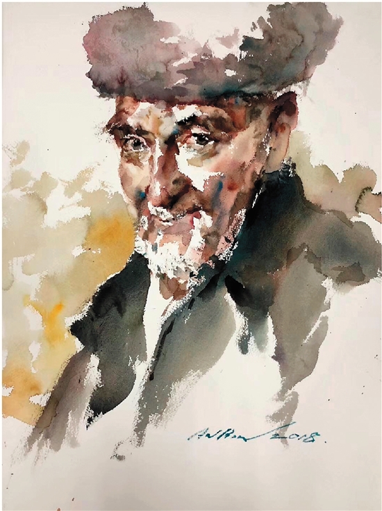 又如他的水彩人物画《南疆老人》,寥寥数笔,神貌毕现,体现出他造型功力的深厚与扎实,高度概括对象的处理能力,色彩干湿交融带来虚实相生、浓郁动人艺术魅力。他的水彩画作品色彩十分丰富,非常敢于用色,但通过色彩的配置与对比却形成十分协调雅致画面景色,体现出很高的色彩素养,表达出光与空间的效果。笔笔如从心底泻出,在虚实中见造型,在不经意中见精神。如果以水墨替换色彩,也是一幅中国画传神之作。他说:他的画“把中国人绘画那种‘畅神’与‘书写’的状态灌注到造型中去,我深深体会到中国人那种笔端在特有的行笔之状与内心把持所带来的意趣并直抵心境。”这完全得力于他早年中国画白描的基础、素描、水彩方面的基本功和对英国水彩画的深入研究的独到体验。