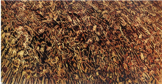 绘画的真理只在绘画现场现身。在画布前战斗,每一个形象都是斗争出来的,每一笔都是战斗的痕迹。在一次次画布前的孤绝奋战中,许江的绘画经历了一个缓慢的变化——从堆积到铺陈,从涂抹到书写;巨幅画面背后的惨淡经营,伴随着笔性中越来越强化的书写意志,使他的画面展现出巨大的张力和强度。笔触追逐着激情,纵横恣肆,飞扬激越,每一笔都是随机纵意的发生和建造,每一刻都蕴涵着战斗中的蛰伏与奔赴。覆盖涂抹,纠结反复,塑造出葵的坚实与凝重;参差错综,笔笔分明,奏响了大地的风霜与雷霆。画室中的困惑与怀抱,绘画时的搏斗与挣扎,无数次开启与遮蔽,无数次无功而返……,终于,群葵一体,从大地深处如铁与血的波浪般奔涌而出,以其沉重的肉身,堆积而为它自身命运的丰碑和祭坛。