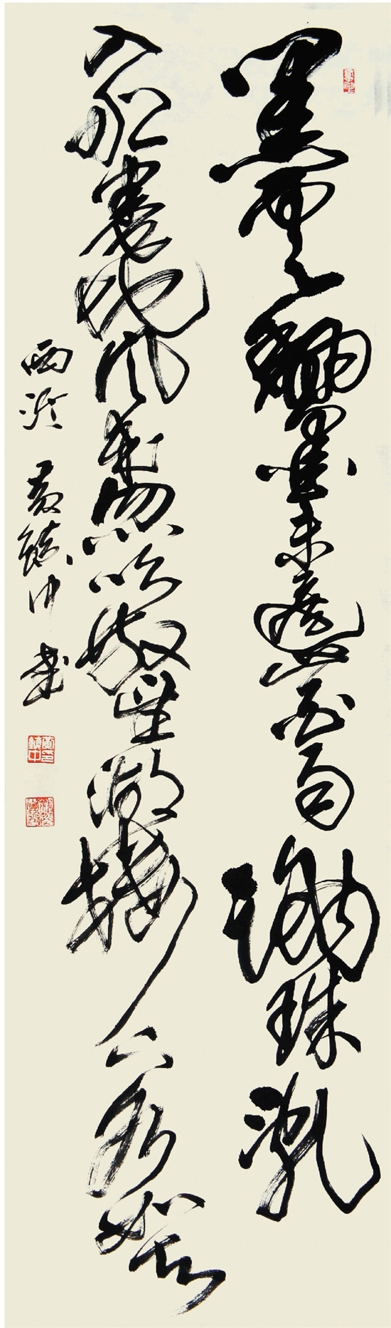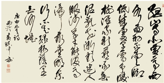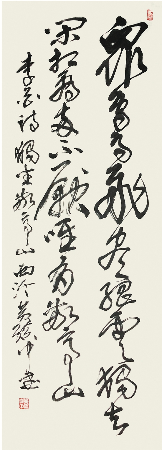 黄老师的创作视角从人物画转到草书,的确是书如其人。从黄老师有志于汪洋恣肆的草书来看,说明他内心激荡着一股浪漫情怀,是一个具有才情的艺术家,不仅书如其人,更如其才、如其志。西泠印社倡导文人士大夫式的综合修养,黄老师功力深厚的草书并不是凭空而来,而是他多年书画结合探索的成果,让人眼前一亮,为我们在书画结合上树立了榜样。