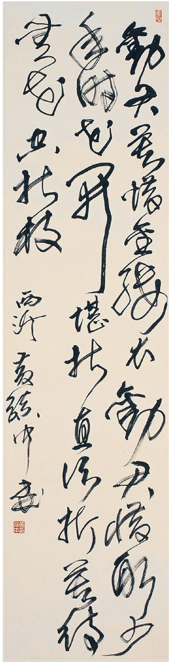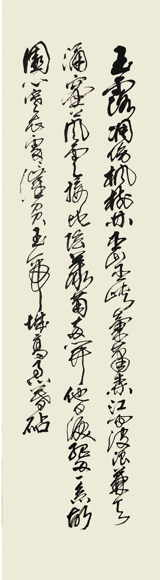 我再提一点不一定准确的意见,大草的节奏感好像缺少休止符。一笔书下来要有个停顿、再起一个高潮,像交响乐一样。书法有魅力正是因为有变化,有变化就有视觉亮点,有亮点就产生美感。书画相通,实际上不是说黄镇中画画得好字就写得好了。书法有书法的形象、绘画有绘画的形象。黄镇中绘画的形象很好,而书法的形象要靠时间去积累,而书法形象哪里来?只有古代的书帖。所以我认为黄镇中对书法是下了功夫的,对线条是有敏感性的。