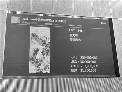 11月20日晚,中国嘉德2018年秋拍“大观——中国书画珍品之夜·近现代”专场,潘天寿1963年的指墨巨制《无限风光》以2亿元人民币起拍,经过激烈竞争,最终以电话委托席的2.5亿元人民币落槌,加佣金2.875亿元人民币成交,再创潘天寿作品交易记录。此前最高价的潘天寿作品是2015年5月中国嘉德春拍上以(加佣金)2.7945亿元成交的《鹰石山花图》。