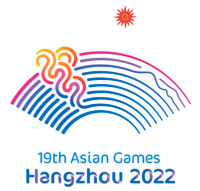 主体图形由扇面、钱塘江、钱江潮头、赛道、互联网符号及象征亚奥理事会的太阳图形六个元素组成,下方是主办城市名称与举办年份的印鉴,两者共同构成了完整的杭州亚运会会徽