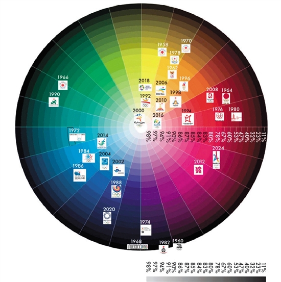 对这种共性的梳理可以让我们了解基本规律,同时避开“雷区”,从而创建一个全新的、未曾视觉体验过的会徽形象。设计过程中,我们反复把设计稿置入过往的18届会徽中,纵向比较,寻找问题。比如,团队梳理了奥运会、亚运会百年形象设计中色彩运用的演变规律,用数据参考修正也避免了主观色彩的使用。