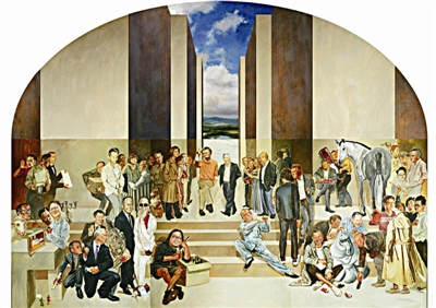 《湖畔大学》在形式上显系脱胎于拉斐尔的《雅典学院》,只是画中人由“柏拉图”们转变为“马云”们,这种变化无论对错,却是实实在在地发生了。于是,作者就按照与雅典学院相仿的尺寸,以“这些人”去对比“那些人”。