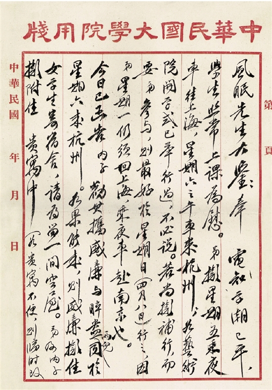 奉电知学潮已平,学生照常上课为慰。弟拟星期五乘夜车往上海,星期六之午车来杭州;为艺术院开学式已举行过,不必说。若尚拟补行,而要弟参与,则最好于星期日(四月八日)行之,因弟星期一仍须回上海,乘夜车赴南京也。今日已函告内子,劝其携威廉与睟盎两儿同于星期六来杭州。如果能来,则威廉拟住女学生寄宿舍,请为留一间空屋。弟及内子拟附住贵寓中(如贵寓不便,则临时改寓湖滨之宾馆亦可,幸勿客气)。被褥枕头等自行携来,下一榻可也。但有扰先生及夫人,殊不安耳。清明时节,故乡好湖山益萦梦寐;重得故人欢聚,欣赏佳作,真大幸运事;希望此次的预定计画,不改忽生阻力。如星期六因事不能来,当电告。