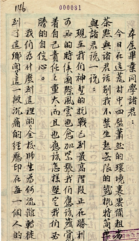 “我们为什么到这里的?全校师生为何流离转徙到了这乡间?这一段沉痛的经历印在每一个人的欣赏,永远不会磨灭,而我们每一次团叙,就有每一次新的检省。”这是他对毕业生的寄言。