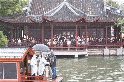 他们面对的风景,是孤山路上从平湖秋月,一路经过月波亭、梅鹤轩,再到浙江博物馆正门前方,大约百来米长的沿湖堤岸。此刻,这里正站着约500位美院师生——正中央的梅鹤轩亭子里,是以美院院长许江为代表的教授们,左右两边有来自各个学院的研究生、导师,最右边的平湖秋月,则是来自32个国家的50位留学生。师生们面朝着东南方向的西湖,与摄影机所在的游船呈现两方“对峙”局面。