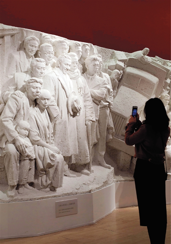 观众在“烽火艺程——沅陵会师”主题浮雕前驻足欣赏