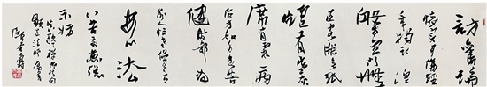 潘天寿最擅长的书体是行草,次为篆隶,楷书较少见。由此可知,他偏爱适宜抒情的书体,因为这样更能抒发雄肆奇逸的阳刚之美。潘天寿曾对学生说:“艺术不是素材的简单再现,而是通过艺人之思想、学养、天才与技法之艺术表现。不然,何贵有艺术。”鉴赏他的书法,可以感受到作者高尚的人品、博大的心胸、深厚的学养以及纵横的才气和精湛的功力。