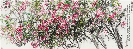 准备了半个世纪之久,终于动笔时,何水法思如泉涌。当巨幅宣纸铺开,毛笔在端砚里饱蘸浓墨时,一幅壮丽的紫荆图已在他脑海里跃然而出。笔底流溢而出的是紫荆花朝气蓬勃、绚烂热烈的气势和积极向上、充满希望的力量,画面上凝结的是何水法半个世纪来对紫荆花的魂牵梦萦。