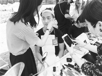 为什么要在男友胸前贴上价目表和支付宝收钱码,小徐有自己的考虑,“化妆的时候腾不出手来,而且摸过钱再涂脸也不干净”。不过她的这招好像效果还不错,不少人被小徐的“营销策略”吸引,小徐的摊位前一直人气很旺,“要是有看好的直接拿走扫一扫就可以了,价钱都贴着,太多了我也记不清。”小徐一边给“模特”化妆,一边对询价的买家说。
