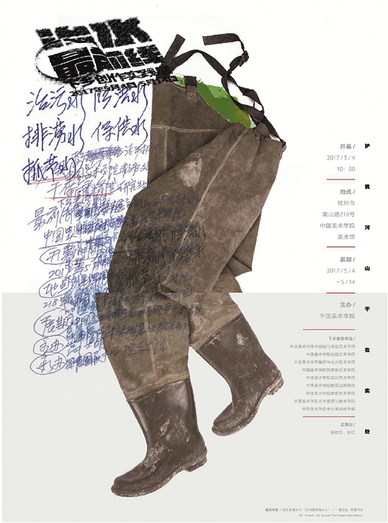 “我要用你的治水护具五件套创作一件海报作品!”当我提出这个要求时,陈望的第一反应是:“这是公家的,我们还要用,而且又脏又臭,你们拿它干什么?”我和他解释意图后,又与缙云县治水办相关负责人商议,想把陈望的治水护具和鞋帽带回杭州进行创作。当地治水办同志非常支持我的想法,次日便和陈望解释,以新换旧,把整套治水用具交给了我们。