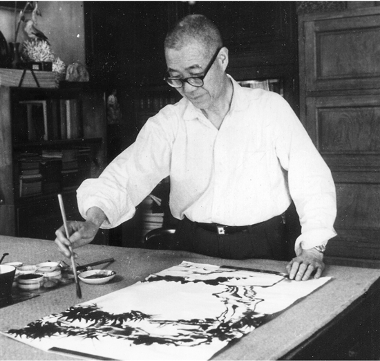 | 1965年,潘天寿在画室作画。
