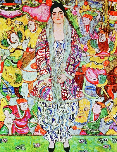 奥地利知名象征主义画家古斯塔夫·克里姆特也有很多东方风情的油画。虽然克里姆特没有来过东方,但他却非常欣赏东方艺术,因此作品背景中出现中国的亭榭、门神、关公就不足为奇了。民俗学家冯骥才曾在《保卫克里姆特最后的画室》一文中提到,克里姆特的书房里挂着中国门神的画像,书柜里陈列着工艺品﹑陶瓷﹑雕塑﹑纺织品等等,他还收藏了许多中国的民间年画。我们能够在克里姆特的作品中找到与中国民间艺术相类似的用色,他在处理人物形象和环境背景时都常采用大面积的平涂填色,画面经常出现桃红、明黄、群青等中国年画中常用颜色,画面色彩对比鲜明,构图简洁,人物形象平面但生动写实,这些都隐隐传递出他对中国民间艺术的吸收和学习。