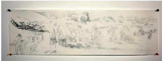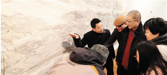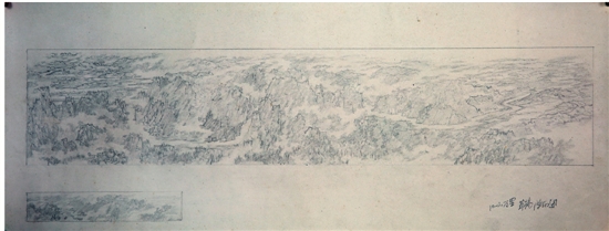 在捐赠仪式现场,记者注意到,木炭草图中央画了一个圈,表示该处要空出来,因为在电视机前呈现的正好是领导人物的位置。于是该处原先勾勒的水纹擦去,调整为以淡花青敷色。