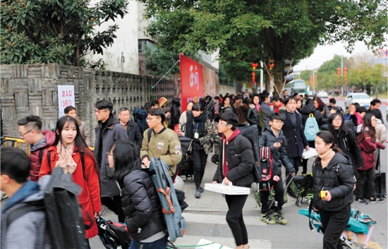 本报杭州讯 记者 夏超 新年刚过,元宵未至,来自全国各地的数万追梦学子已集结杭州,他们要为实现自己的“艺术梦”而努力,迈过一道最为重要的门槛。2月7日开始,中国美院2017年的本科招生专业考试正式拉开了帷幕。今年,全国共有6.5万余人次报考了中国美院,其中杭州考点为4.4万人次。开考第一天,近9000人在杭州考点参加了考试,当天考试的专业之一便是今年最为热门的图像与媒体艺术类,录取比例高达50比1。中午时分,中国美院象山校区的北门外已经聚集了大量的考生家长,他们满怀期待地望着校门口方向,等待着自己的孩子。由于天气寒冷,有的家长甚至带来保温饭盒,只为让孩子在短暂的午休时间里,吃顿热饭,休憩一下,为下午的考试继续做准备。为什么那么多考生会选择中国美院?上午的考试大家发挥如何?带着这些疑问,记者利用考生中午休息的时间,进行了随机采访。