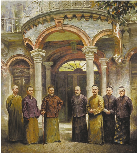 油画家潘鸿海、汪文斌的《湖山掩映——浙江近代国学大师》描绘了龚自珍、章太炎、王国维、马一浮等一代文化名人的形象,这些名人的命运与近代中国的命运紧密相连。 (下转第18版)