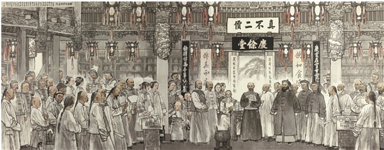 | 荣获优秀奖的《国药之脉——胡庆余堂国药号》(国画) 池沙鸿