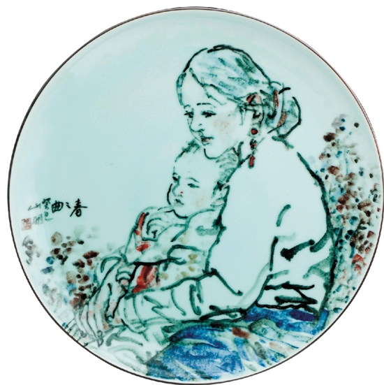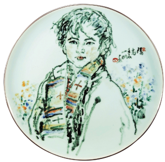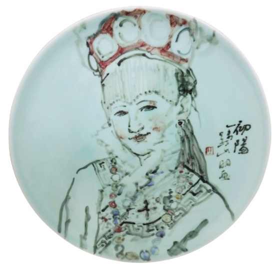 于是,不知出于何种机缘,山明先生在青瓷绘画里找到了这种“浑然之虚”探索的可能性。青瓷的釉色在烧造过程中,将他绘画的笔墨和颜色融会,产生了一种滋润互补的效果,呈现出一种浑然的华滋。而青瓷釉色之美的虚空与他绘画人物或花鸟构图之间虚实的呼应,又产生了一种整体的营造,这种营造,完成了山明先生在宣纸上某些所不曾有的意境期待,青瓷千年自产生以来所不曾有过的与书写性绘画结合从此出现,我想,这不仅是中国绘画的一次有意义的新探索,也是青瓷的一次巨大革新。