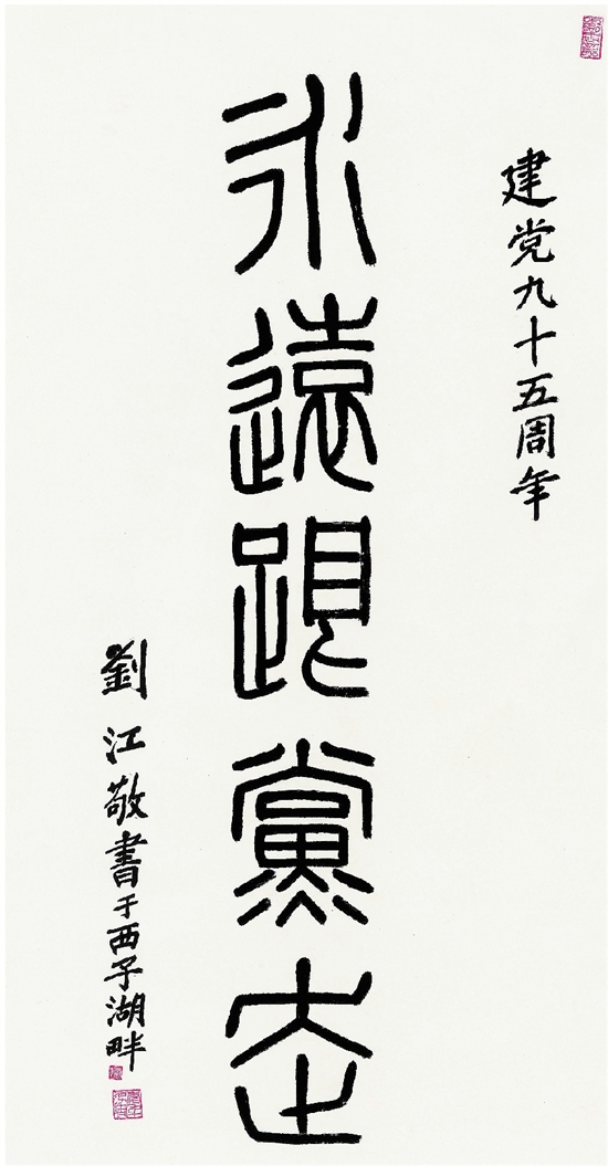 此次大展最年长者——西泠印社执行社长刘江先生,在接到省作协的参展任务后,他用八尺整张写下《永远跟党走》等篆书作品。曾驰骋于硝烟炮火之中的他表示:“坚定的信念仍然是新时代浙江书法家战胜困苦的精神动力,就像长征途中,先辈们脚下踏着华夏坚实的土地,手中高擎着民族振兴的大旗,正是这样的信念将他们紧紧地凝聚在一起,筑成一道摧不垮、压不倒的钢铁长城。正是这样的信念支撑着他们走过艰难、走出希望、走出了一片蓝天。”