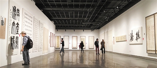 | 观众在观看“浙江书坛名家二十一人精品展”。