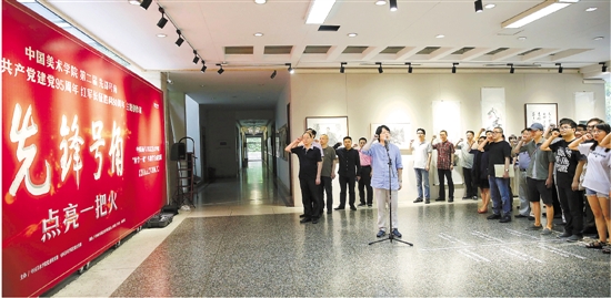 | 6月27日,中国美院纪念建党95周年主题创作展开幕。中国画与书法艺术学院党员师生重温入党誓词。 本报记者 魏志阳 摄