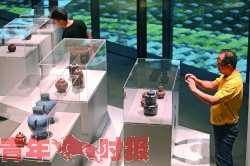 昨日,记者探访落入位于转塘的中国美院象山校区的民艺博物馆,虽然长假很多学生回家过节,但校园里的人数不减反增,除了由普利兹克奖获得者王澍设计的象山校区本身就像一个很美的公园之外,另外一大看点就是由日本设计师隈研吾设计的民艺博物馆。民艺博物馆在国庆期间推出了四个展览,其中“砂者为上——紫砂工艺的鉴赏与解读”展无疑是最醒目的一个。“这几天参观人数都在近千人,大家都很有兴趣来看这些美丽的紫砂壶。”民艺博物馆宣传负责人金晓依告诉记者。