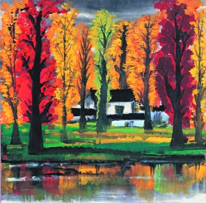 在林风眠的风景画中, 其“秀色”会显得特别的浓烈、浓郁,色彩很饱满,其实就是因为他画树干几乎都是用黑色,衬托了画面上的黄、橘黄、白等颜色。他的色彩特别的饱满,就是黑色陪衬的效果。在黑色的陪衬下,他作品中的黄色就自然而然地表现出来绸缎的感觉。