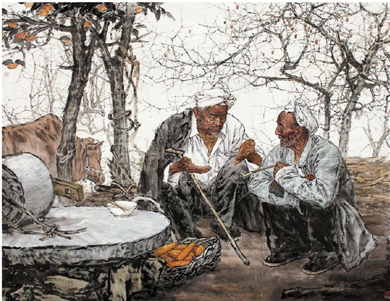 你看,从浙江画家刘文西的那幅已成为时代经典的《祖孙四代》,既深得浙派人物画“勾花点叶式”笔墨的秀润,却也浑厚朴实,后者无疑来自于画家数十载扎根于陕北,对黄土高原和汉唐文化的深切感悟;版画家李焕民的《初踏黄金路》《藏族女孩》和徐匡的《高原的阳光》《主人》乍看很“像”——画中几位藏族同胞脸上表情让人感到心头一暖,那是源自心底的笑容。