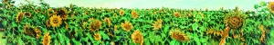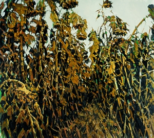 “2003年8月的一天,在小亚细亚高原,我蓦然遭遇一片夕阳下的老葵。那葵钢浇铜铸一般,与大地浑然一体。它们正朝向同一个地方,太阳从它们身后缓缓落下。我仿佛看到一群老兵,也看到我们自身,那曾经向阳花开的一代人。那一瞬间,我所有的关于向阳花的经验——那时代的群体命运和现实的风雨沧桑,那交叠我心并在记忆中蒸煮了几十个年头的经验——被怦然激活。我看到了将一代人的生命历史性地活化而为的存在。我不仅看到了葵,而且看到了葵的荒原表情,看到了一个季节和站在季节边上的自己, 从此开启了我的葵园绘画。每次创作,我都仿佛回到那里,回到那个夕阳西下、大地苍茫的‘众神的黄昏’。那个时刻是我葵园记忆的起点,也是我后来无数葵园意象的家园。”