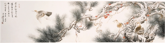 “莫道春早与春迟,万蕊千花总入诗。不信试看双寿鸟,凌风飞上最高枝。”你看他的勾勒,婉丽中见挺劲;他的傅色,妍丽中具清新——《山鹊蛱蝶》和《花木鸣禽》则集中体现了他工笔花鸟画的特色。