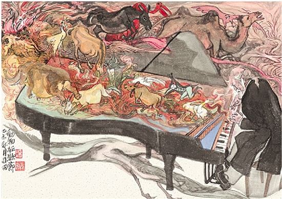 记:你喜欢音乐,记得之前说最希望能够在创作中交融音乐与绘画,这次展出的《动物狂欢节》在画面上表现了你这方面的爱好。