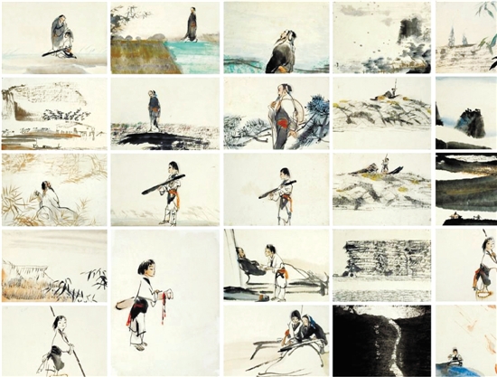 “从前的水墨动画,都是用大师的作品作为动画中的一部分元素。例如《小蝌蚪找妈妈》用了齐白石的虾和蝌蚪,《牧笛》用了李可染的画风。而我们的《山水情》却不一样,我和卓鹤君,我负责人物设计,卓鹤君负责山水背景,我们为这部动画设计的分镜稿大约有200多张。最后呈现在动画中的,有许多是我们两个人的原画。例如开场的第一个画面,老琴师站在江边等船,就是我的原画。而动画中凡是静止的山水背景几乎都是卓鹤君的原画。我设计的人物在运动的时候是上美厂的老师画的,但我为人物做的设计很细致,渔家少女撑船、师徒弹琴的镜头,我把能画的动态全部都画出来了。”