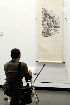 作为一名记者和国画爱好者,我几次前去参观。最大的感受是,大师虽然离去,但追随者众多,他的艺术典范和精神品格依然激励着后辈。人们在他的画前驻足、瞻仰、赞叹,有的甚至摆开画具,现场临摹。这张照片,便是我在现场拍到的:一名观众,正在现场临摹黄宾虹的山水画作品。