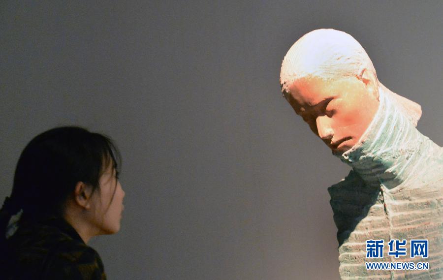 11月20日,一名参观者在第九届中国当代青年陶艺家作品双年展上欣赏陶艺作品《肖像》。
