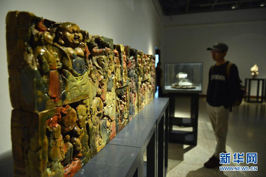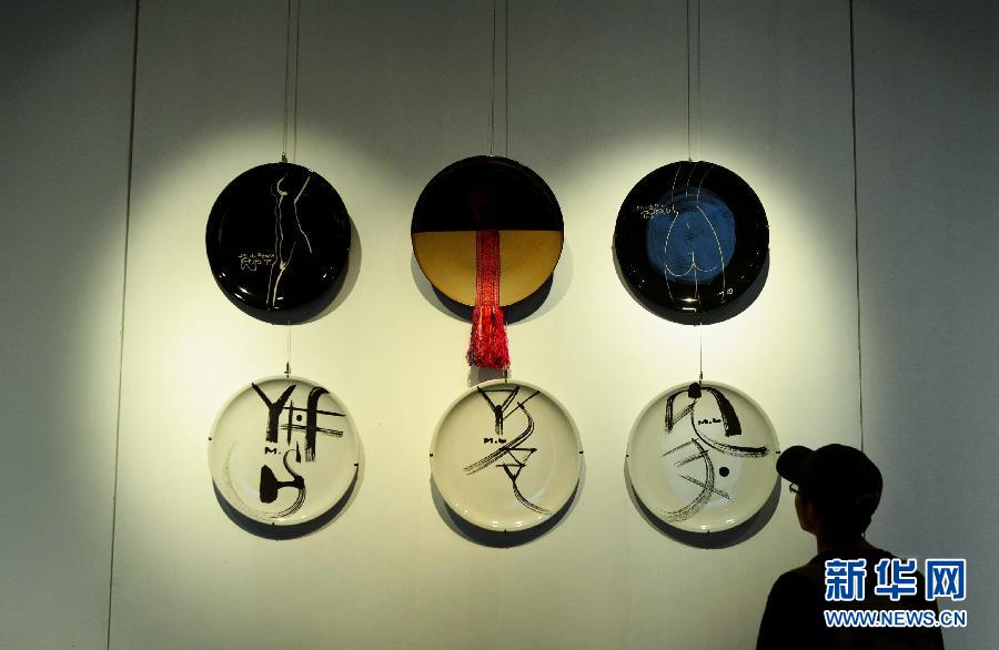 11月20日,参观者在观赏韩美林的陶艺作品《天书盘》。当日,第九届中国当代青年陶艺家作品双年展暨2014杭州国际当代陶艺双年展在位于杭州的中国美术学院美术馆开幕,展出国内外69位艺术家的近300件陶艺作品。新华社发(龙巍)
