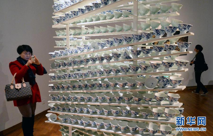 11月20日,参观者在第九届中国当代青年陶艺家作品双年展上欣赏陶艺作品《景德镇》。当日,第九届中国当代青年陶艺家作品双年展暨2014杭州国际当代陶艺双年展在位于杭州的中国美术学院美术馆开幕,展出国内外69位艺术家的近300件陶艺作品。新华社发(施健学)