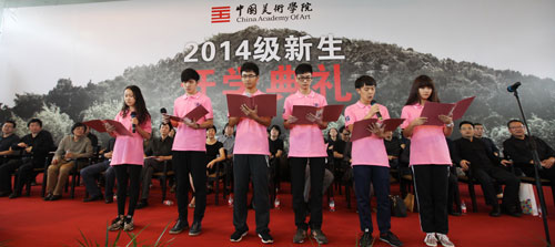 在中国美术学院2014年的开学典礼上,新生收到了一份特殊的“礼物”——一本《千字文》的字帖、两支毛笔、一瓶墨汁、一刀纸。许江院长希望同学们能在摹写千字文的过程中,放怀千古,遥会贤人,深刻体会“读书养心”的精神血统。图为学生代表在朗诵《千字文》。 申博 摄