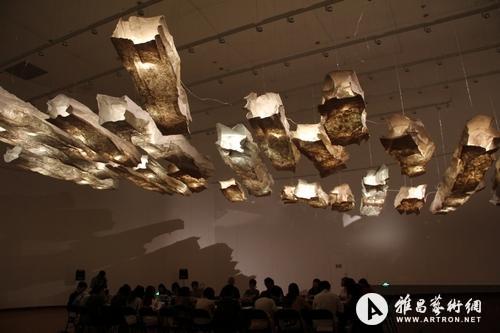 施慧:这件作品酝酿了很久。那时为了取纸浆,我经常往返于杭州和富阳之间,在这条路上常常看到从很多烟囱里冒出黑色的、灰色的烟,所以当时是想从环境污染的角度出发,做一组白云与冒着黑烟的影像相结合的作品。但在做的过程中却不断地调整,最后只留下了“云在飘,风在飘,空气在飘、心绪在飘”的意境。它很轻,但看起来并不轻。当你站在作品下面的时候会感觉自己很渺小,它更像天上坠落的陨石,让人产生对天地宇宙浩瀚无边的感悟。