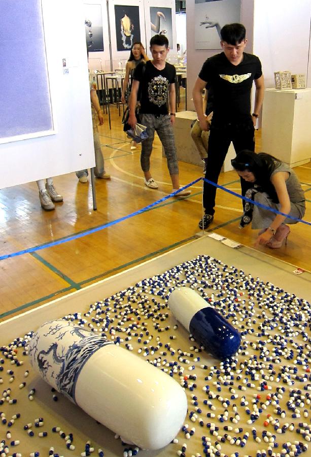 5月27日,观众在欣赏中国美术学院学生田景深的毕业作品陶瓷装置《问“题”胶囊》。新华社记者王小川摄